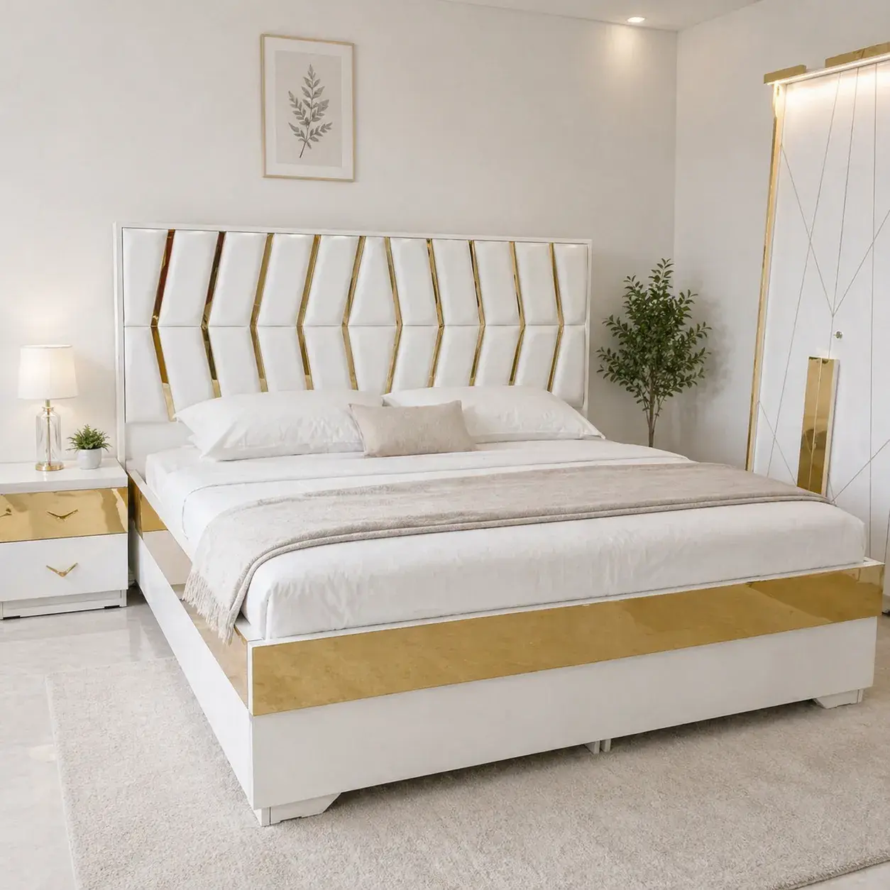 Modern Luxury Design Elegant white finish with premium gold accents for a rich and contemporary bedroom look Integrated LED Wardrobe Lighting Built-in LED light on wardrobe enhances visibility and adds a premium aesthetic feel Complete Bedroom Set with Dressing Table Includes bed with designer headboard, wardrobe, dressing table with mirror, and bedside table for a fully coordinated setup Spacious Storage Solution Wardrobe offers ample space with hanging area, shelves, and compartments for organized storage Functional Dressing Unit Dressing table comes with mirror, drawers, and shelves for easy daily use and storage Stylish Designer Headboard Upholstered panel design with gold detailing adds a sophisticated touch Premium High Gloss Finish Smooth glossy surface with gold highlights for a luxurious appeal Durable & Sturdy Build Strong construction ensures long-lasting use and everyday reliability Smooth Hardware & Fittings Quality hinges and fittings provide effortless operation